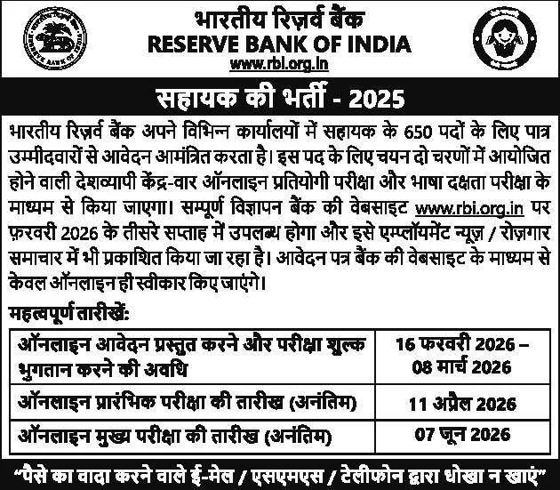 RBI Assistant Online Form 2026 :- The Reserve Bank of India (RBI) has issued a notification for online recruitment for 650 vacant Assistant positions. If you are interested in a job as an Assistant at the Reserve Bank of India, this is a great opportunity. If you are a graduate, you can apply. Details on how to fill out the online form are provided below. For more information, please visit the official website.