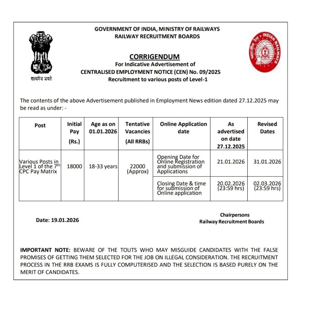 RRB Group D Recruitment 2026 :- Railway Recruitment Board (RRB) has released a new notification for Group D Level 1 recruitment under advertisement number CEN 09/2025. There are a total of 22,000 vacancies, and all interested and eligible candidates can apply online. The online application process for Railway Group D will be open from 31 January 2026, to 02 March 2026. All interested and eligible candidates should fill out the form before the last date. Please refer to the official notification before applying; the link is provided below.