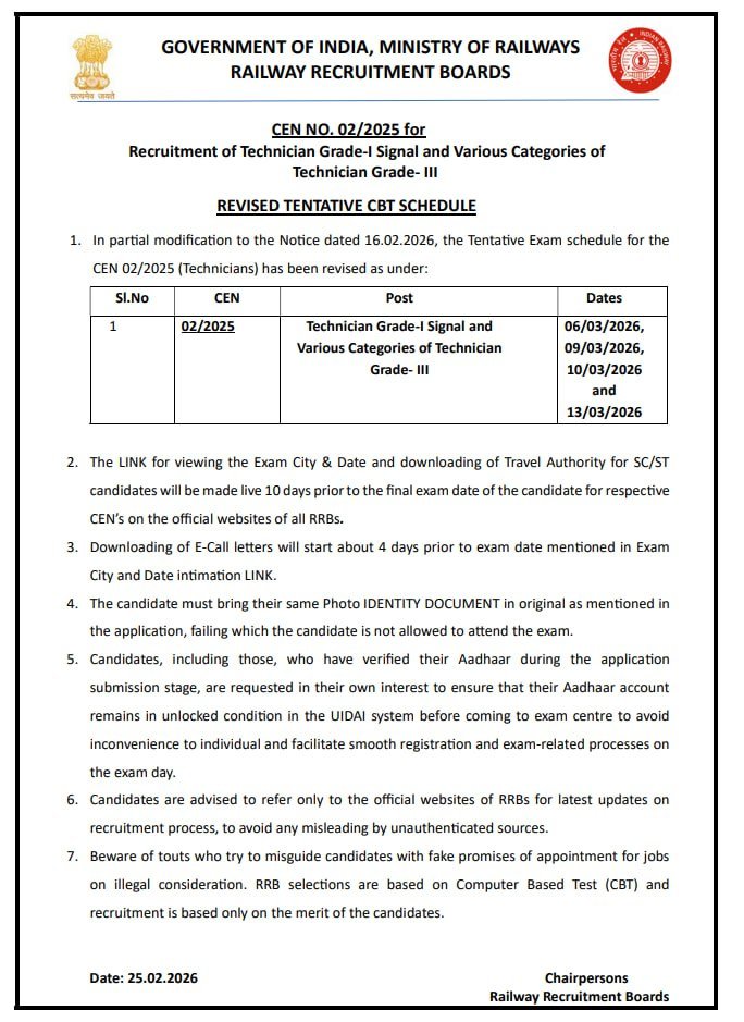 RRB Technician Admit Card 2026 :- The Railway Recruitment Board (RRB) has activated the link to download the sting commission slip and admit card for the Technician recruitment under advertisement number CEN 02/2025. City intimation slips will be available for checking from February 26, and admit cards will be available for download on March 4, 2026. Admit cards must be downloaded in A4 size format. Important download information is provided below on this page. For more information, please visit the official website.