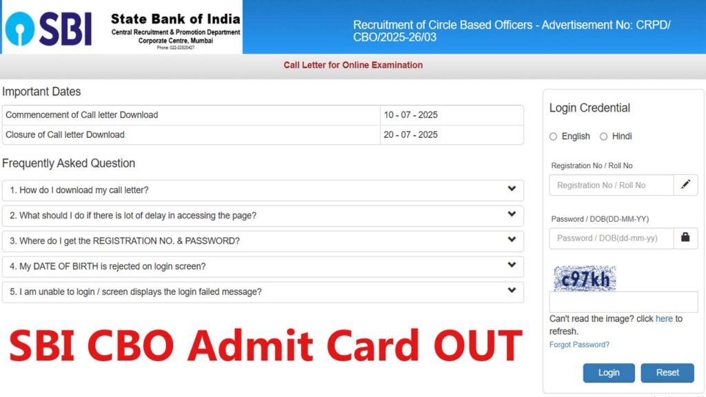 SBI CBO Admit Card 2025 :- State Bank of India has released the exam date for the post of CBO. All the candidates who had applied for the post of Circle Best Officer. There is very good news for all those candidates. The exam for all of you has been conducted on 20th July 2025. All the candidates who want to appear in this exam. They will first download their admit card through this page. As soon as the admit card link is released. You will get information about it through this article.