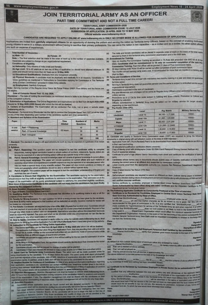 Territorial Army Officer Recruitment 2026 :- The Joint Territorial Army has issued a notification for the online recruitment of 12 Officer posts, for which applications are currently being accepted online. The online application window will remain open from April 12 to May 19, 2026, and the examination is scheduled to be held on July 12, 2026. All interested and eligible candidates are advised to verify the details and submit their applications before the final deadline.